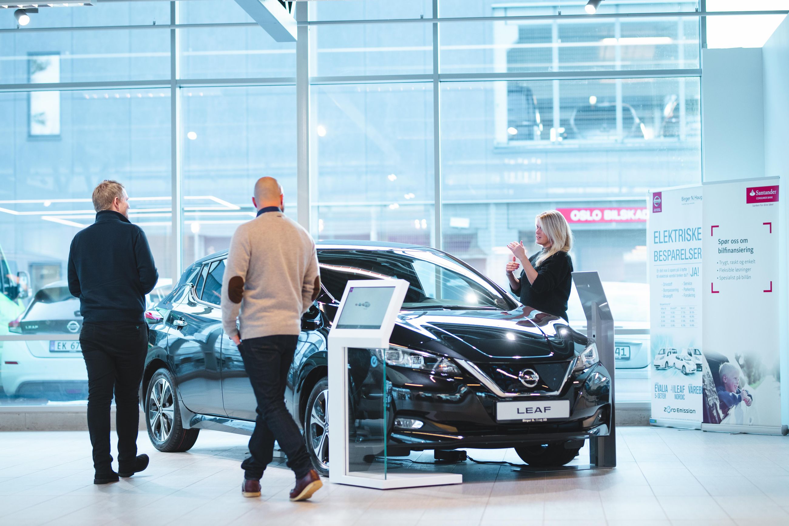 – Dette er en typisk problemstilling for familier i og rundt Oslo nå om dagen. Mange er usikre på både hvilken bil de skal velge og om de skal kjøpe eller lease, sier han, og tar med paret bort for å vise fram elbilen Nissan Leaf.
