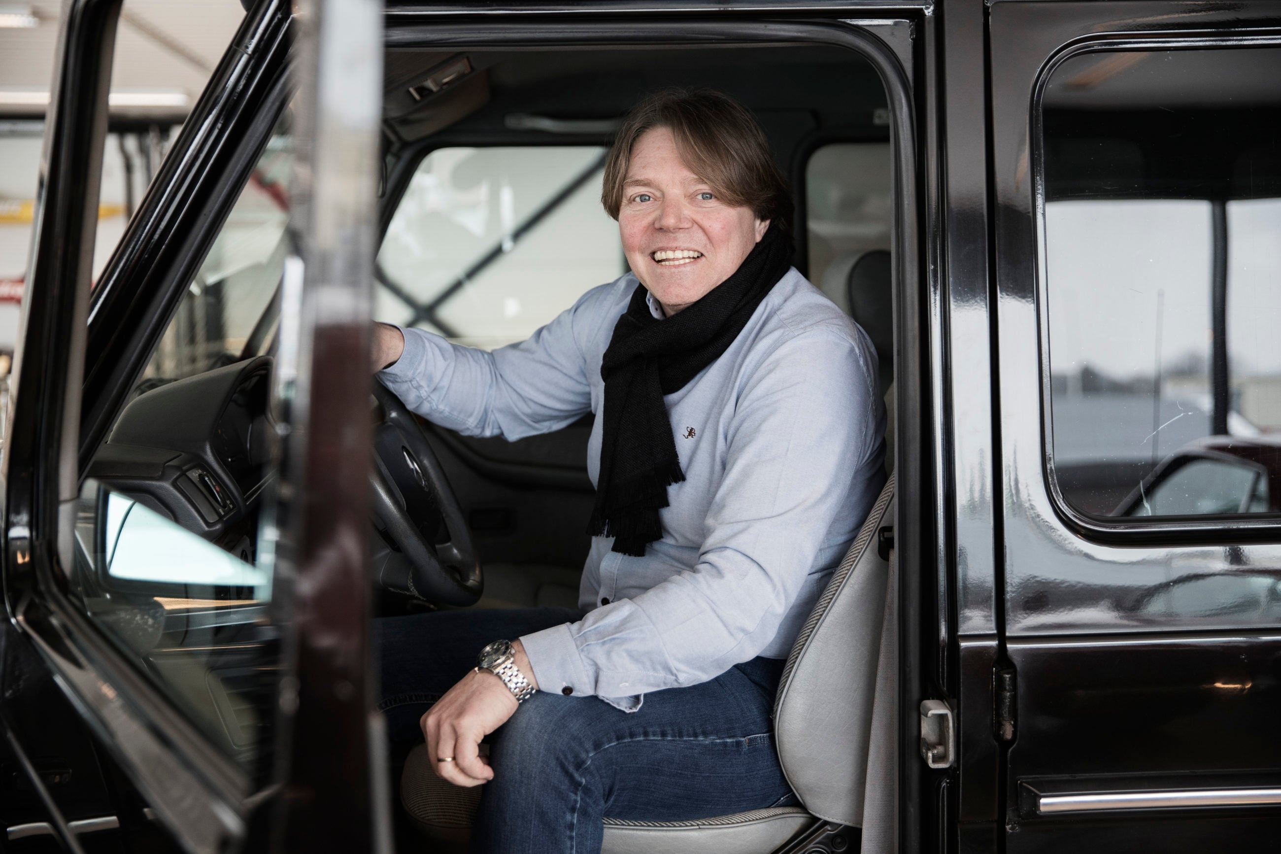 Fredrik Dahle Olsen hos Autopartner Fredrikstad i en Mercedes-Benz Geländewagen, et eksempel på en veteranbil han mener fungerer godt som bruksbil.